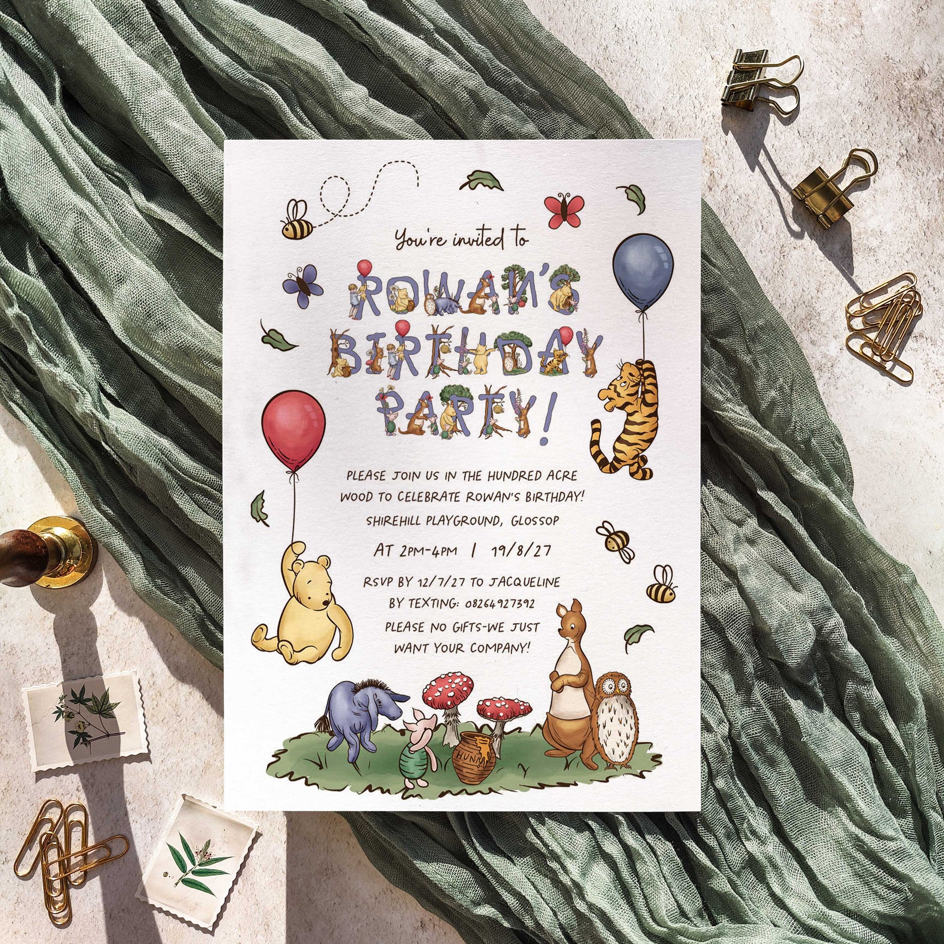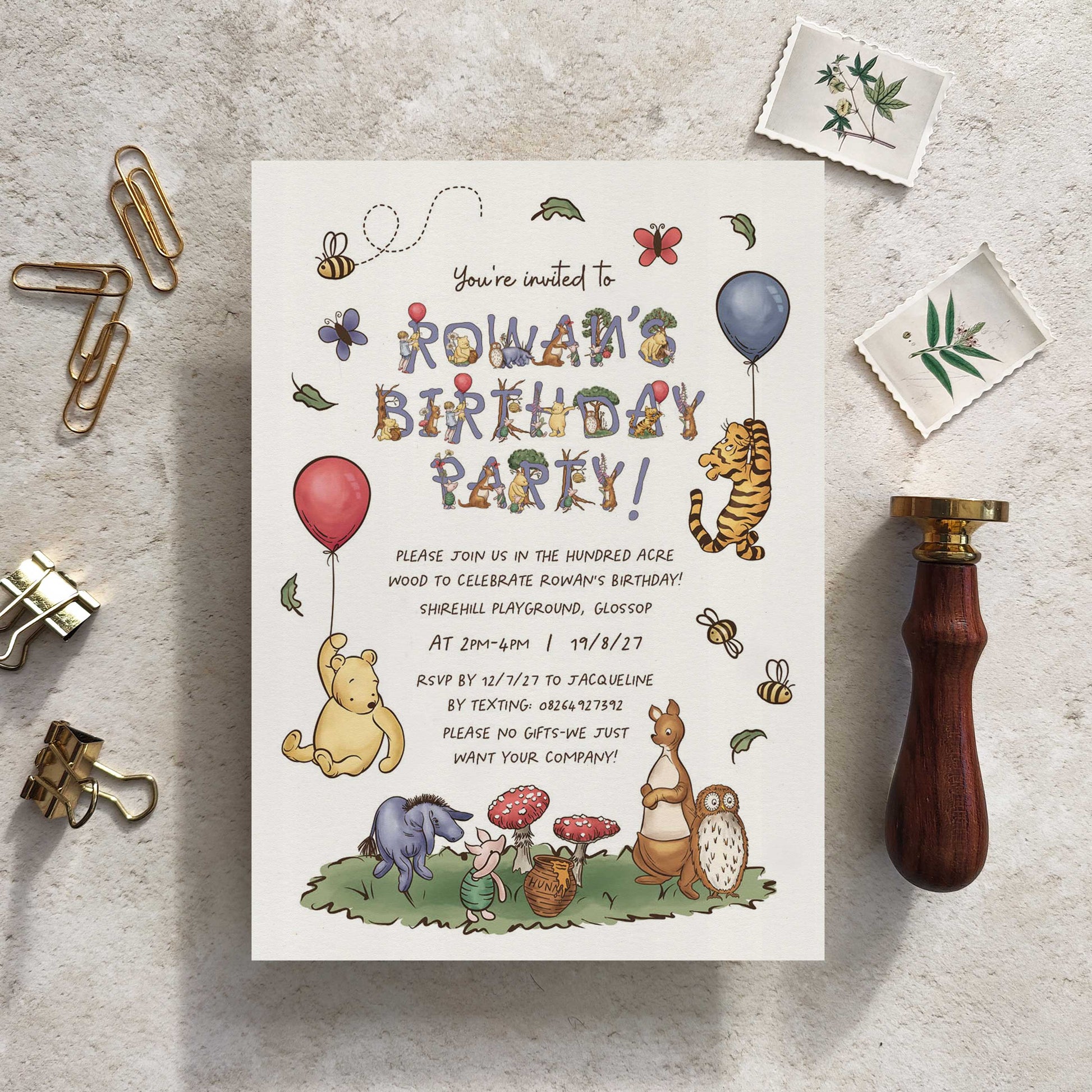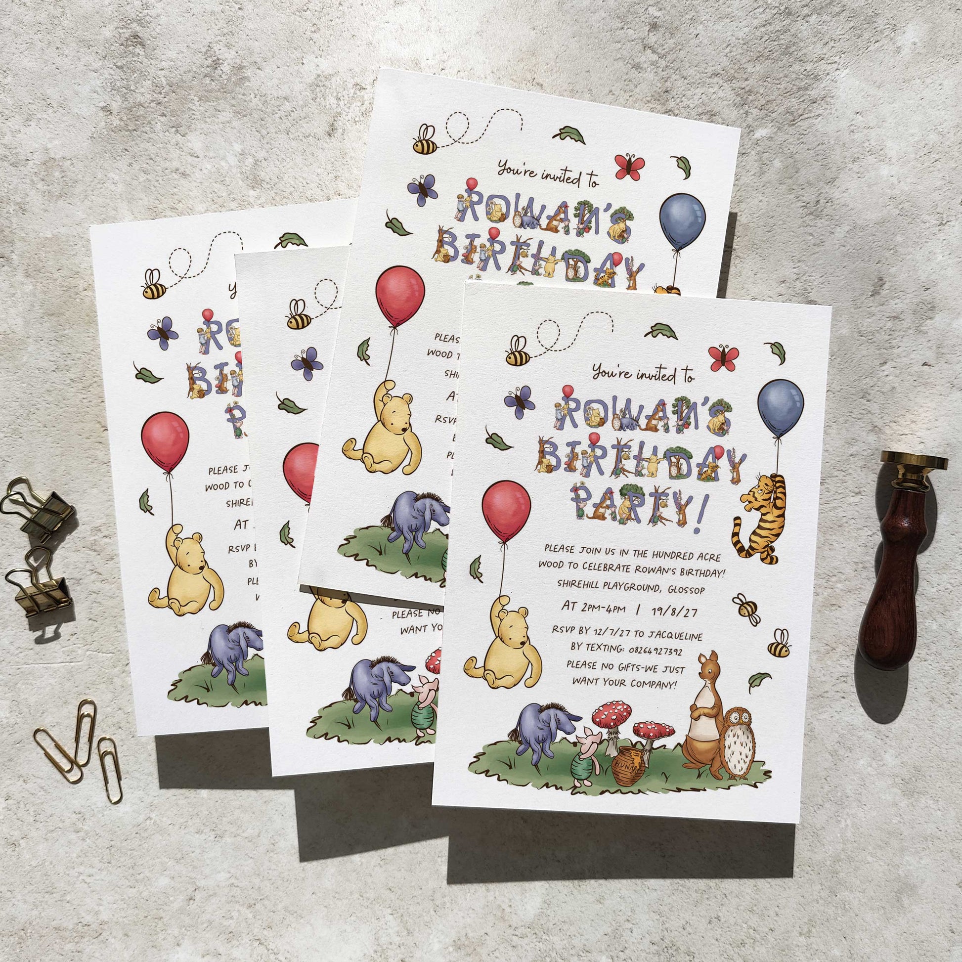 10 x Winnie the Pooh Personalised Birthday Party Invitations and Envelopes
