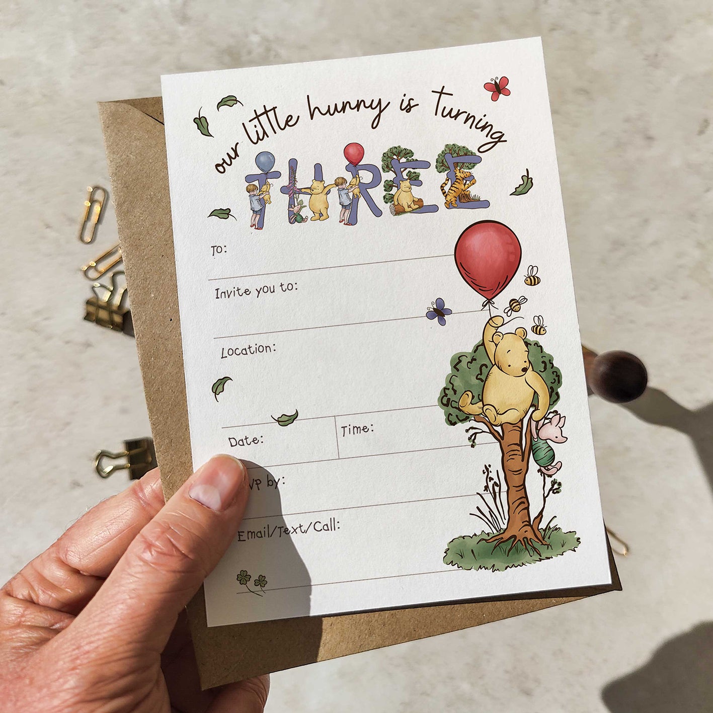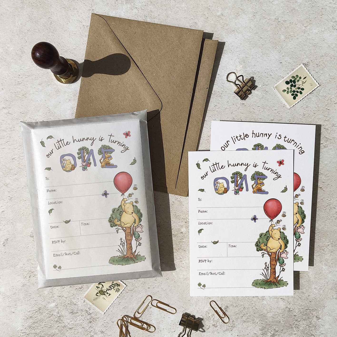 Celebrate your little one's special day with these charming Winnie the Pooh party invitations! Each set includes 10 beautifully hand-drawn illustrated cards featuring everyone's favourite honey-loving bear. Simply fill in your party details in the dedicated spaces—perfect for 1st, 2nd, or 3rd birthday celebrations. Matching envelopes are included, making it easy to send out invites in style. A delightful way to set the tone for a magical Hundred Acre Wood-inspired party!