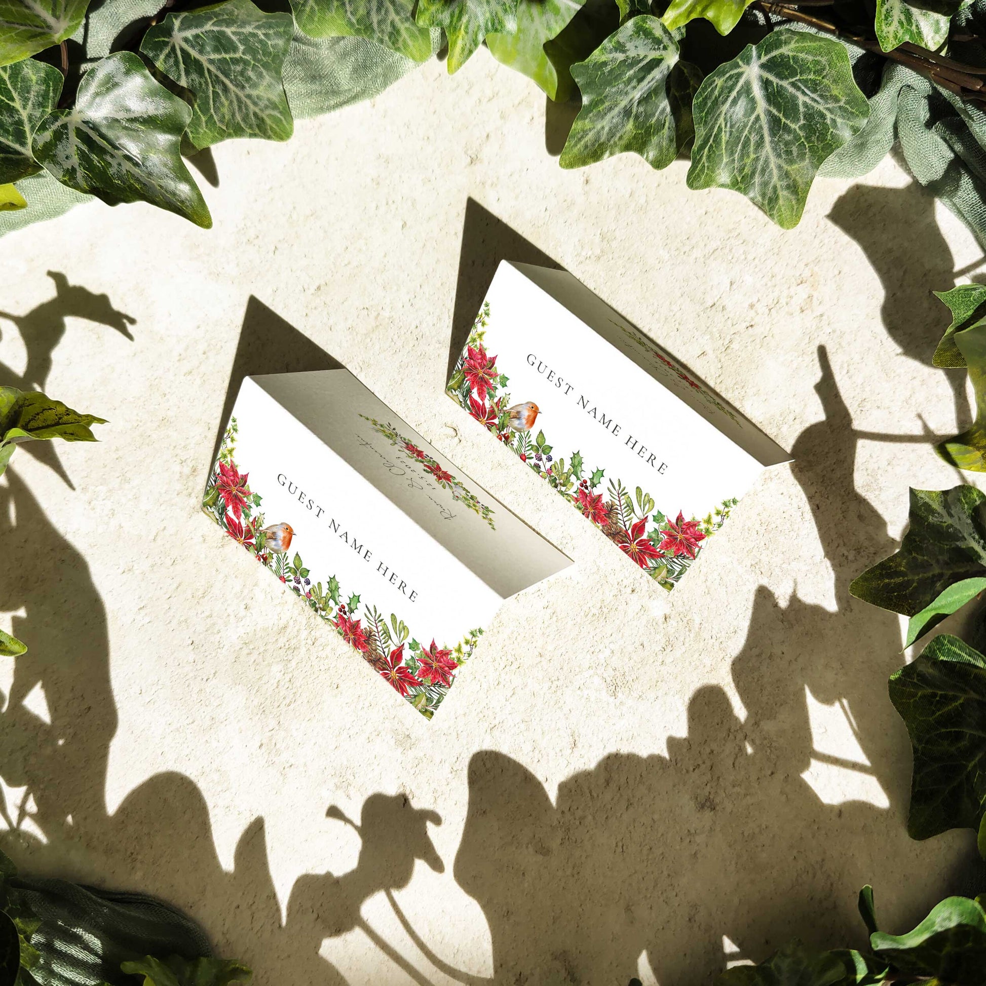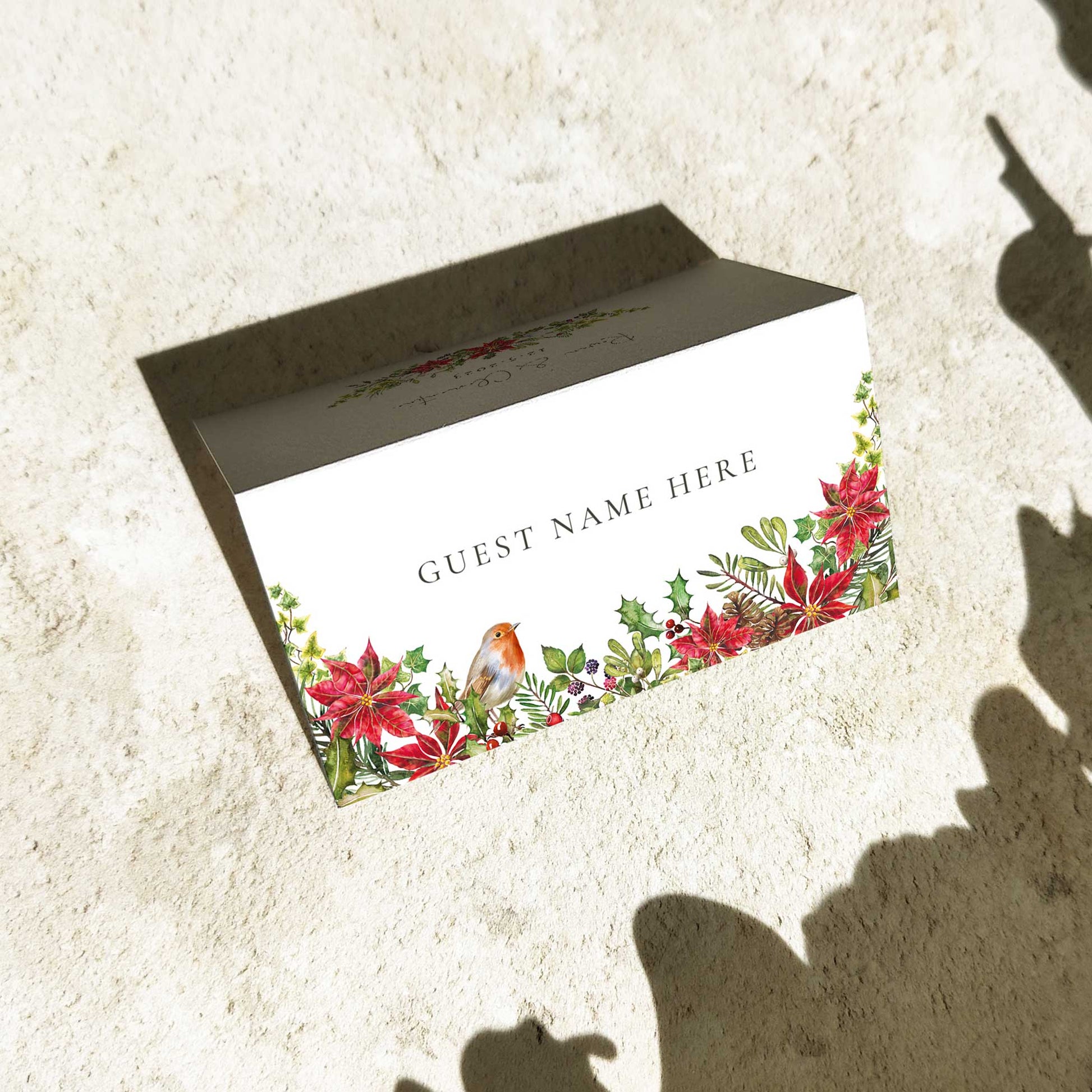 Elevate your holiday table with our Christmas Watercolour Folded Place Cards. Featuring unique winter botanical illustrations in beautiful watercolours, these rustic yet luxurious cards add an elegant touch to any gathering. Optional printed guest names make seating arrangements a breeze.