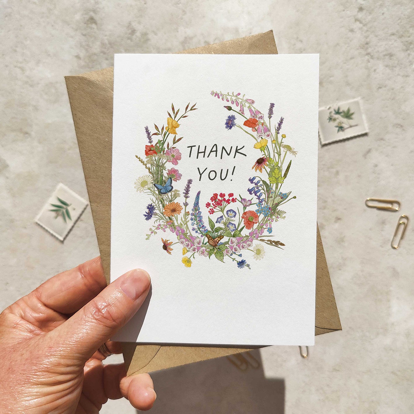 Celebrate gratitude with understated elegance. These folded thank you cards feature a delicate hand-drawn wildflower design on luxurious off-white card stock, evoking the charm of a cottage garden. Each set arrives with recycled brown envelopes, combining thoughtful design with environmental responsibility. Perfect for expressing appreciation with genuine style and care.