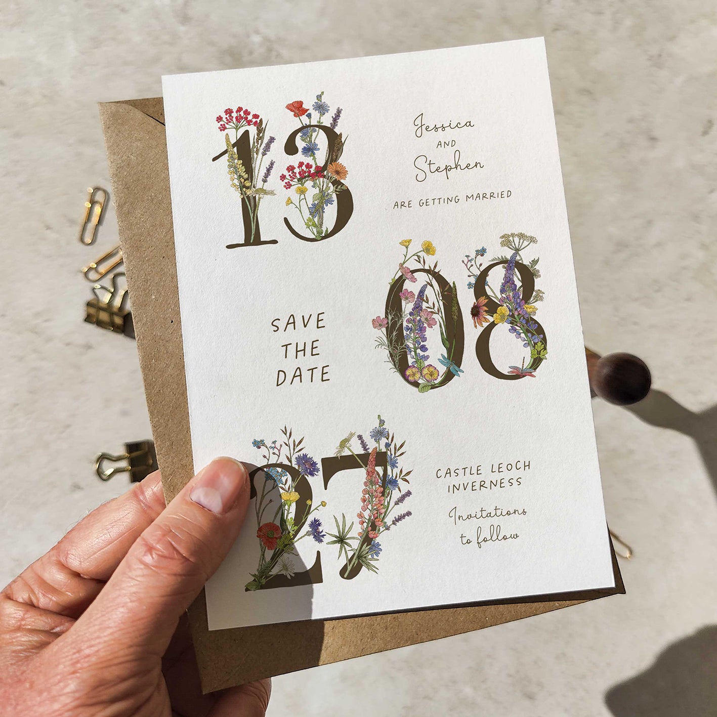 Announce your special day with charm and natural elegance. These enchanting save-the-date cards feature personalised wildflower numbers displaying your wedding date, creating a botanical-inspired keepsake your guests will treasure. Each card captures the whimsical beauty of a cottage garden, blending rustic appeal with sophisticated design. Perfect for couples seeking a distinctive way to share their celebration date, these cards set a warm, memorable tone for your upcoming nuptials. Let your guests know when to mark their calendars with a touch of floral grace.