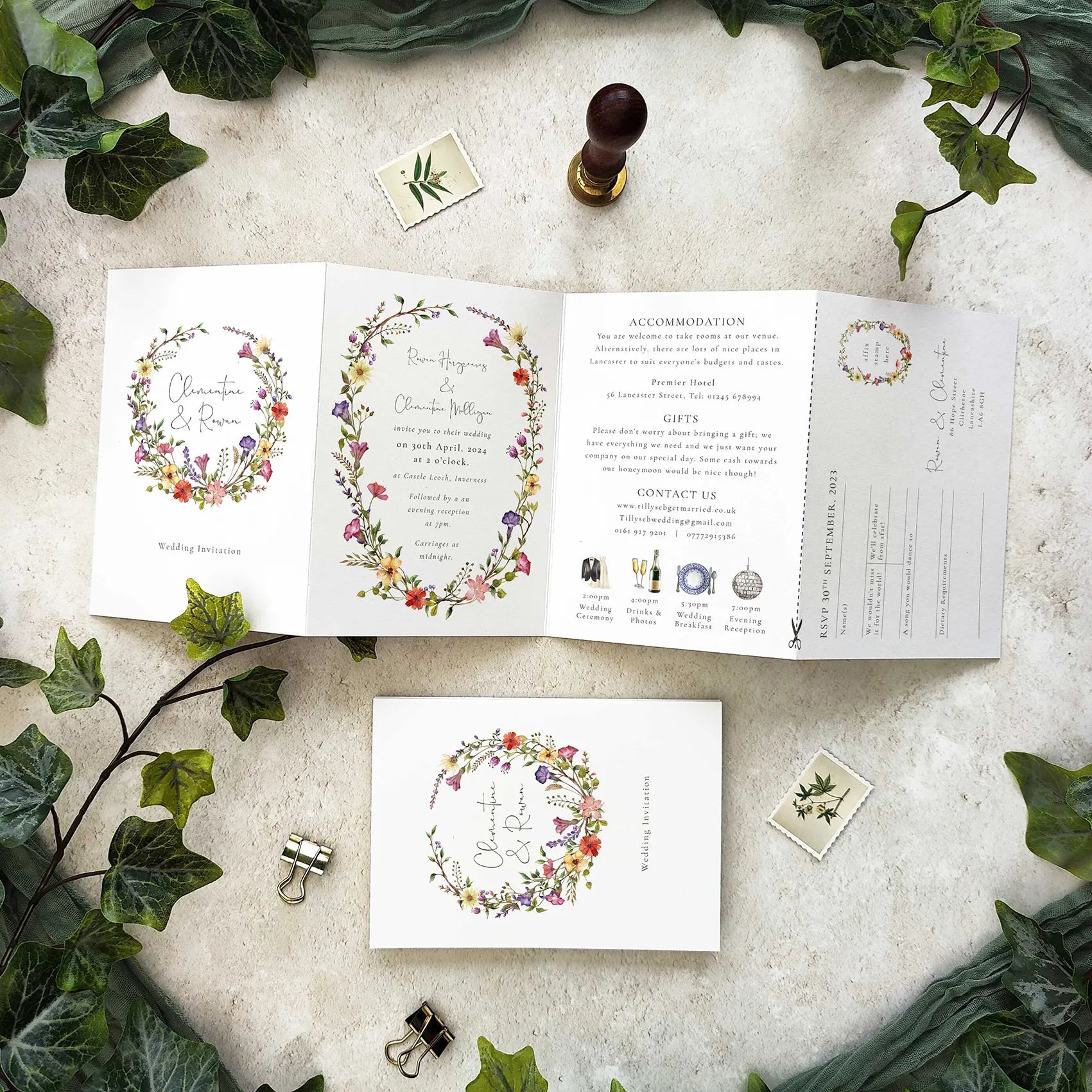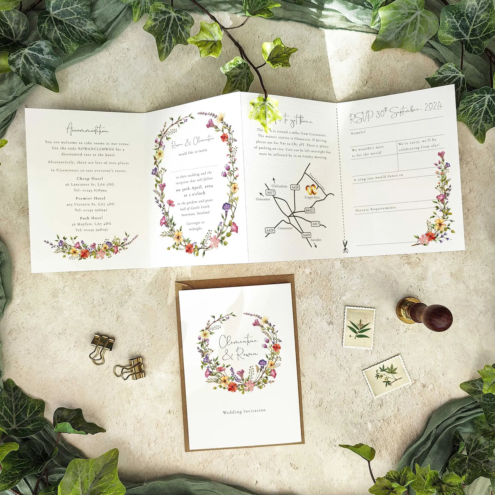 Printed to luxury smooth off-white card and supplied with C6 plain kraft or white envelopes unless upgraded to colour envelopes of your choice. The last section can be a cut-off RSVP card or a guest information section.