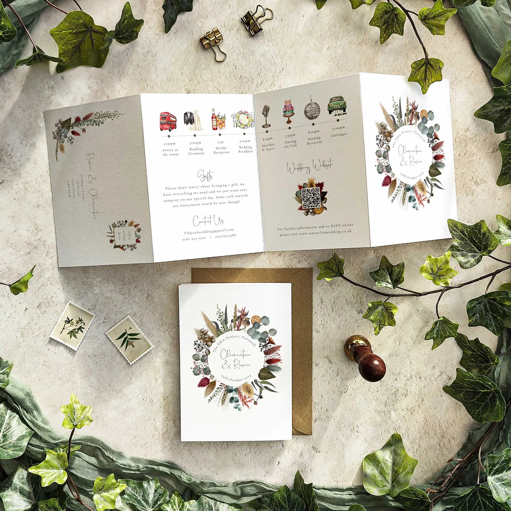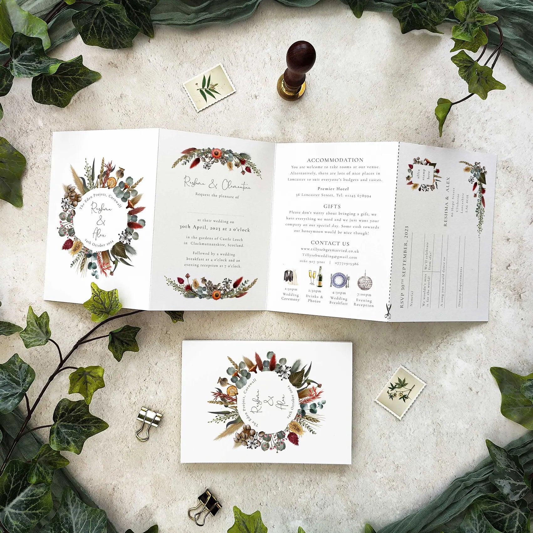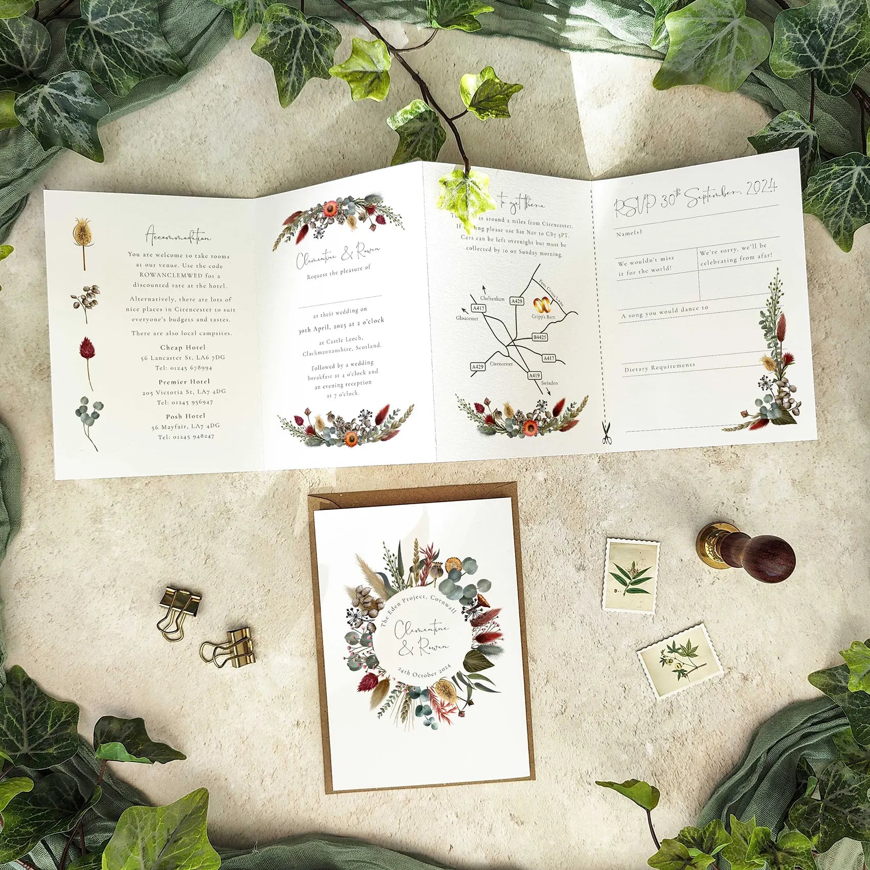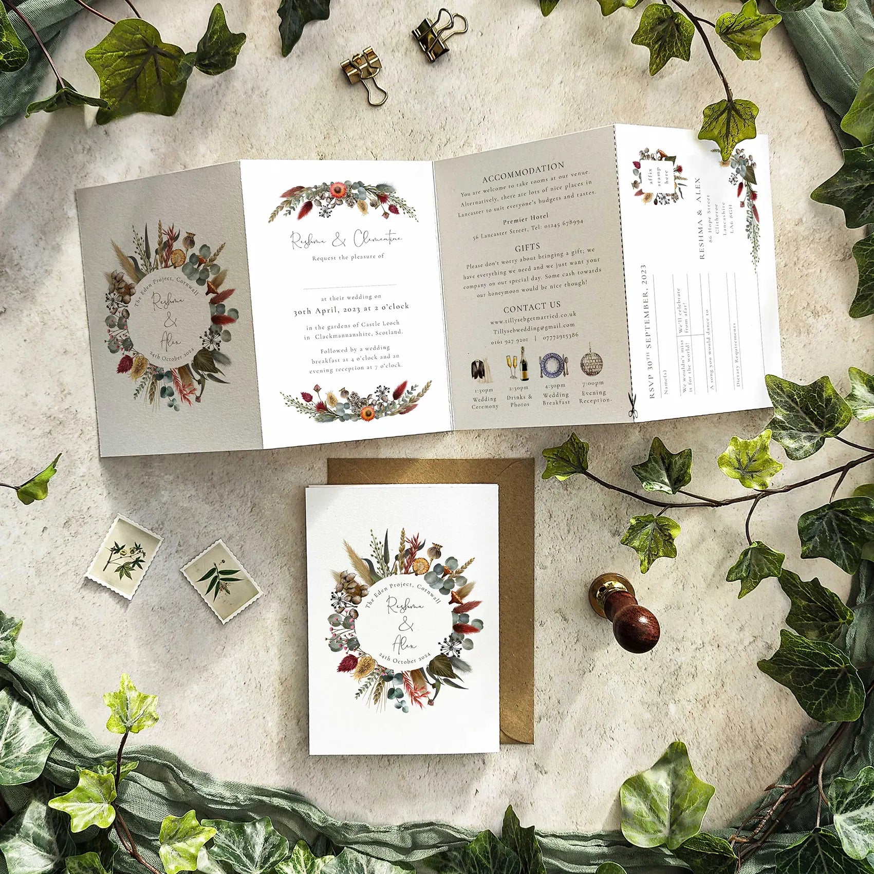 Discover our elegant Dried Flowers Concertina Invitation, ideal for an autumnal wedding. The folded design showcases muted tones of burgundy, brown, and plum, evoking the beauty of watercolor art. Personalize with optional envelope liners and colored envelopes for a truly one-of-a-kind invitation.