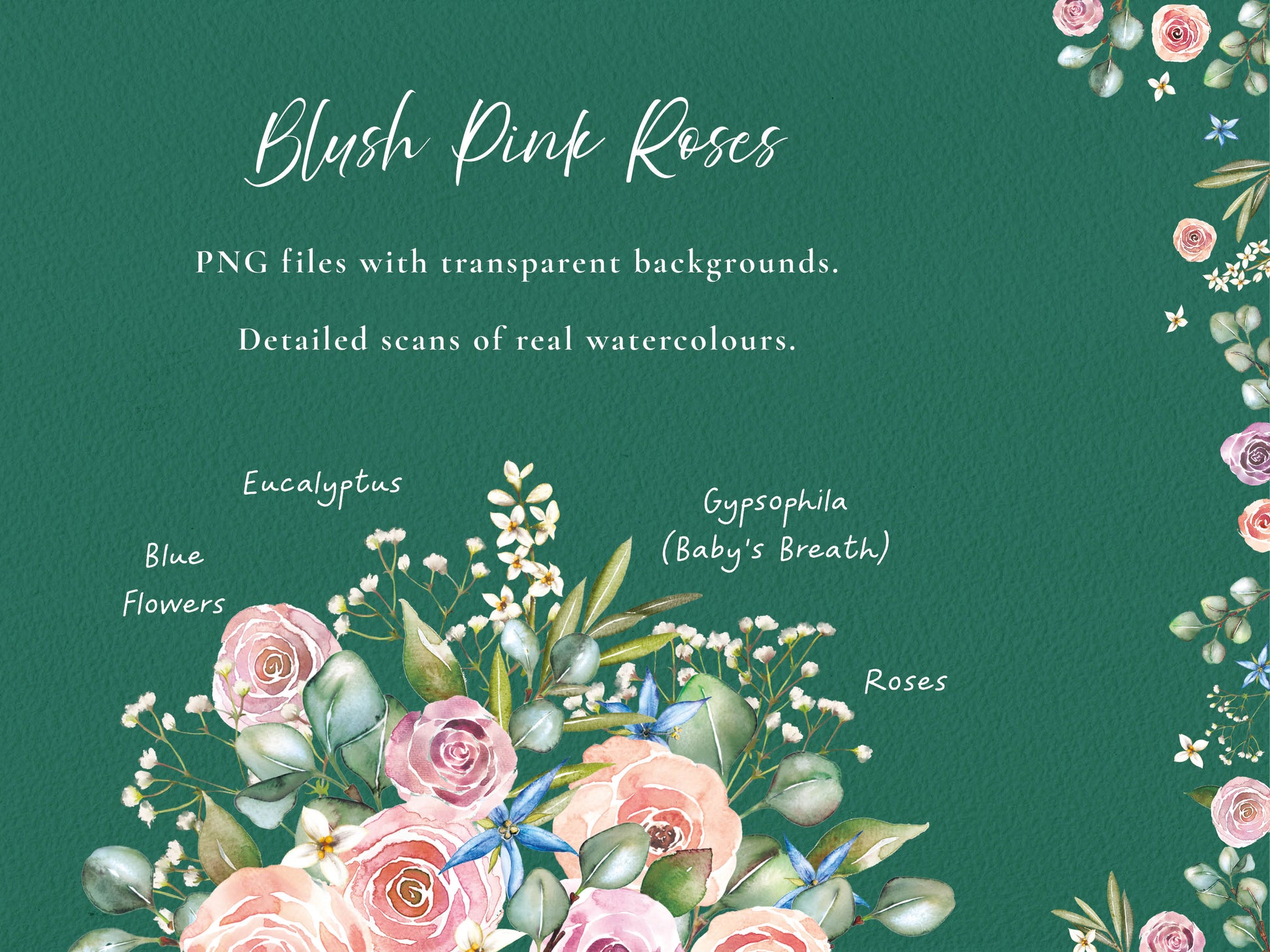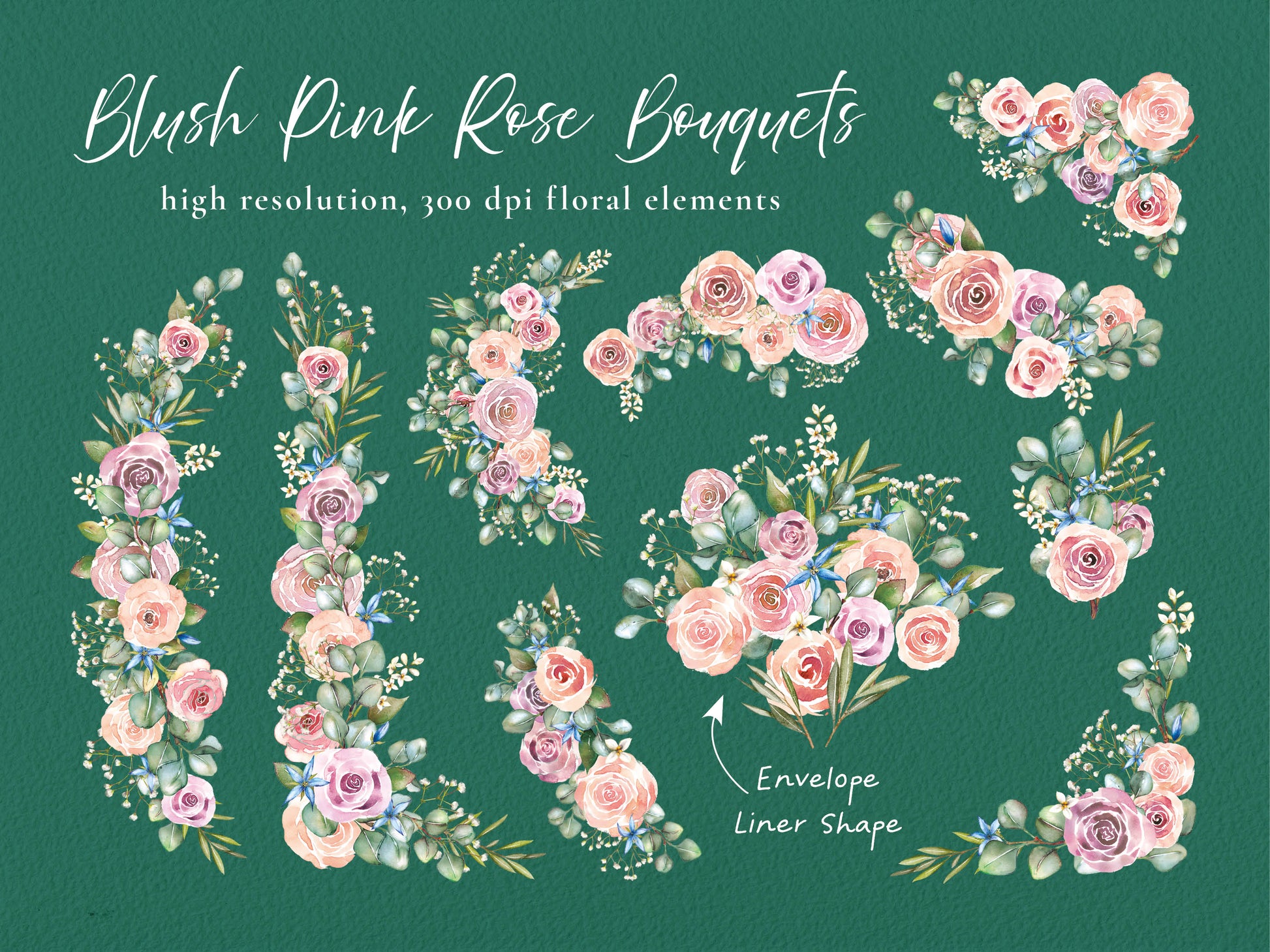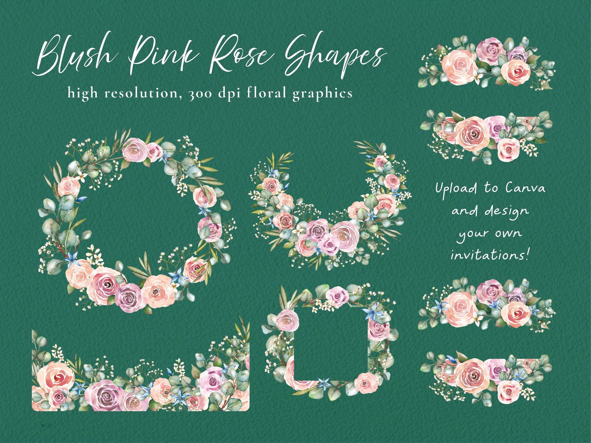 Discover our hand-painted watercolor blush pink roses, eucalyptus, and gypsophila digital PNG collection! Featuring a vast array of borders, bouquets, and shapes, these 3000px-wide (some larger), 300dpi RGB PNG files with transparent backgrounds are perfect for wedding stationery, DIY cards, stickers, and digital planners.