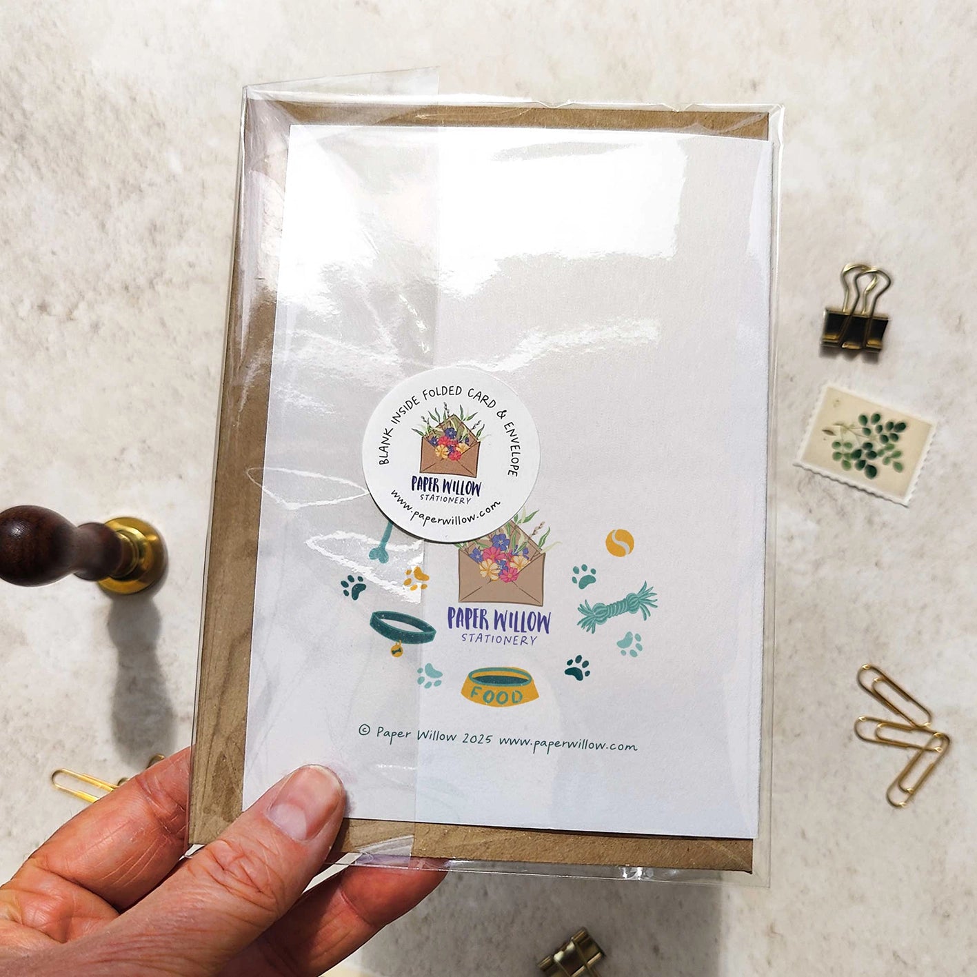 Folded note card made from thick luxury cardboard, digitally printed and supplied with plain kraft brown envelopes.