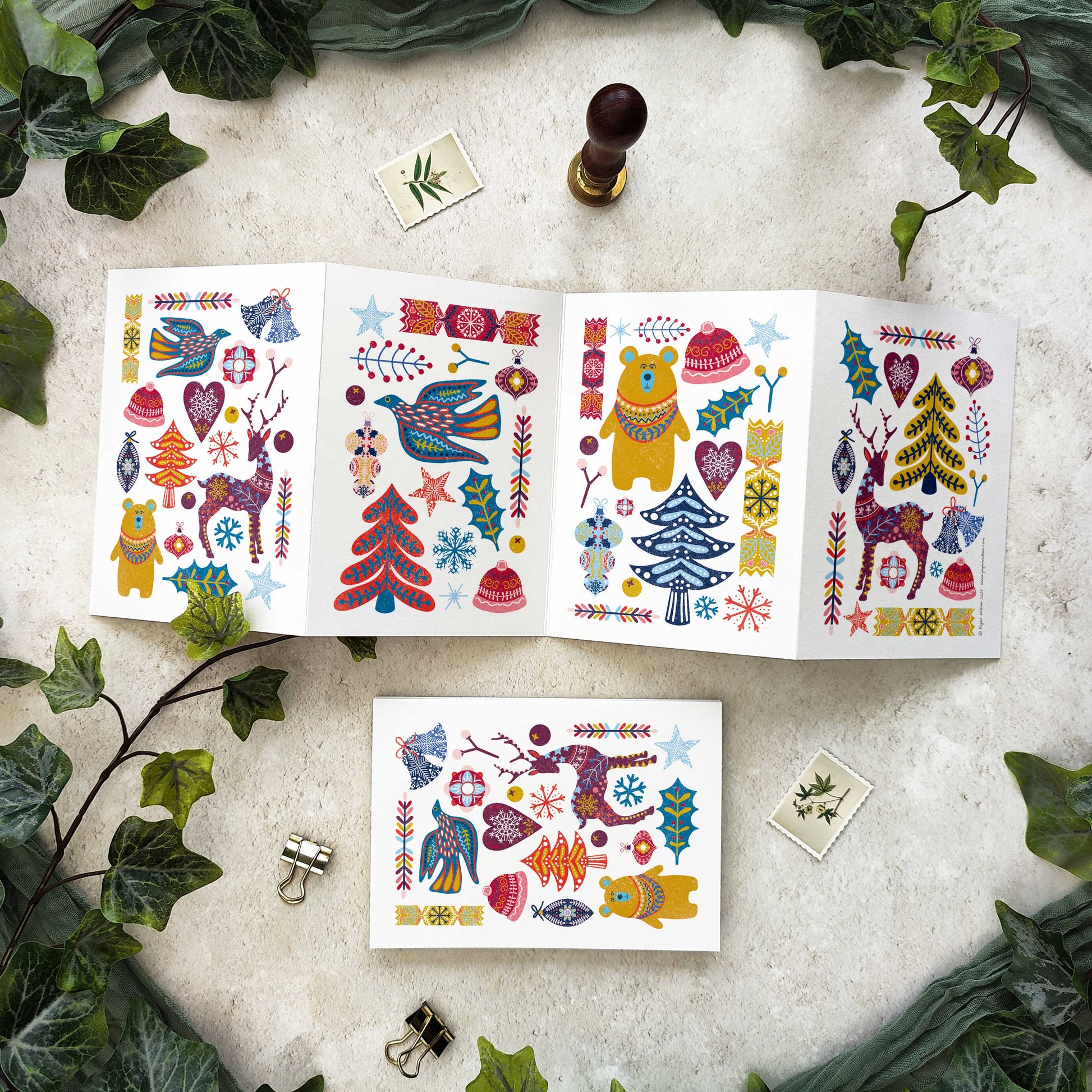 Elevate your Christmas correspondence with these exquisite Scandinavian-inspired concertina cards. Printed on luxurious 300gsm smooth off-white cardboard, they unfold to reveal an impressive 148mm x 420mm canvas showcasing beautifully rendered Nordic animals and festive motifs in a sophisticated, restrained colour scheme. The architectural elegance of the multi-fold design transforms these cards into display-worthy pieces that enhance any mantelpiece or shelf throughout the season. The blank reverse provides the perfect space for your heartfelt message, making them an ideal choice for those who appreciate quality stationery and thoughtful gift-giving. Each card arrives with a matching envelope, ensuring a complete, premium presentation that your recipients will treasure.