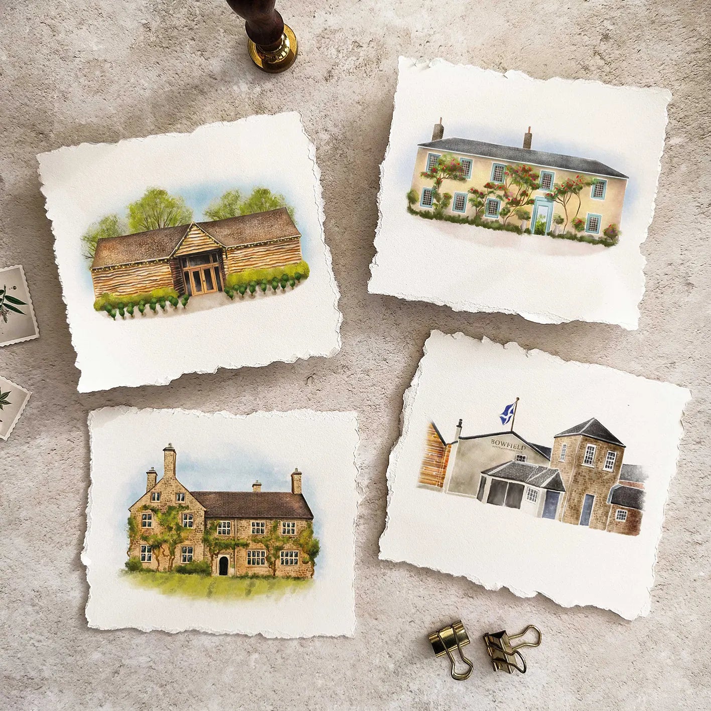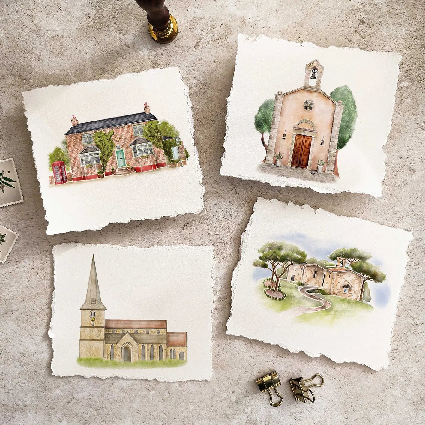 We paint venues digitally using a digital pen and ink or watercolour technique. We work from photography we find online unless you supply us with better images. We may choose angles to paint from that will look nice on your design (such as a front on view for a front cover).