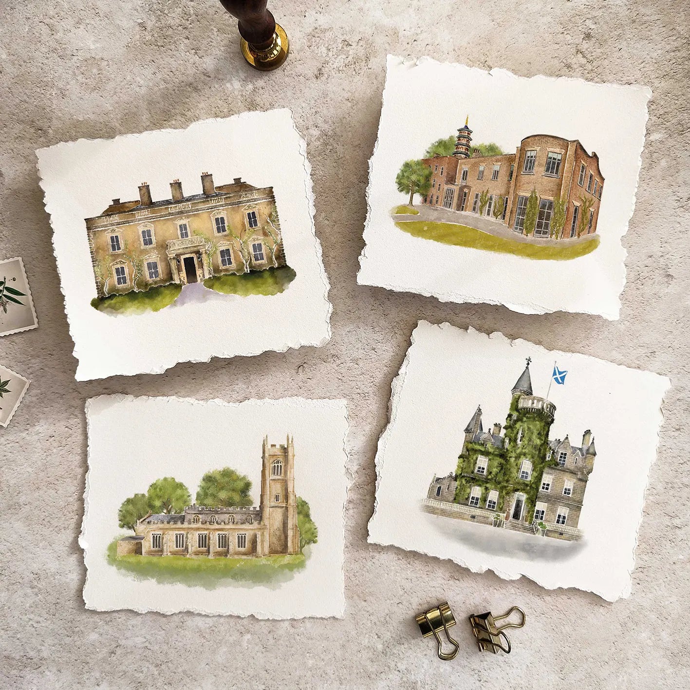 Occasionally a customer comes to us and they already have a venue painting. In most cases we can use it within your stationery as long as you have permission from the artist to use it (this is usually quite easy to obtain). Other things to consider are: will the picture you have match the stationery made by Paper Willow? (Has it been painted in a similar style) and do you have a high resolution version of the image that we can print from nicely?