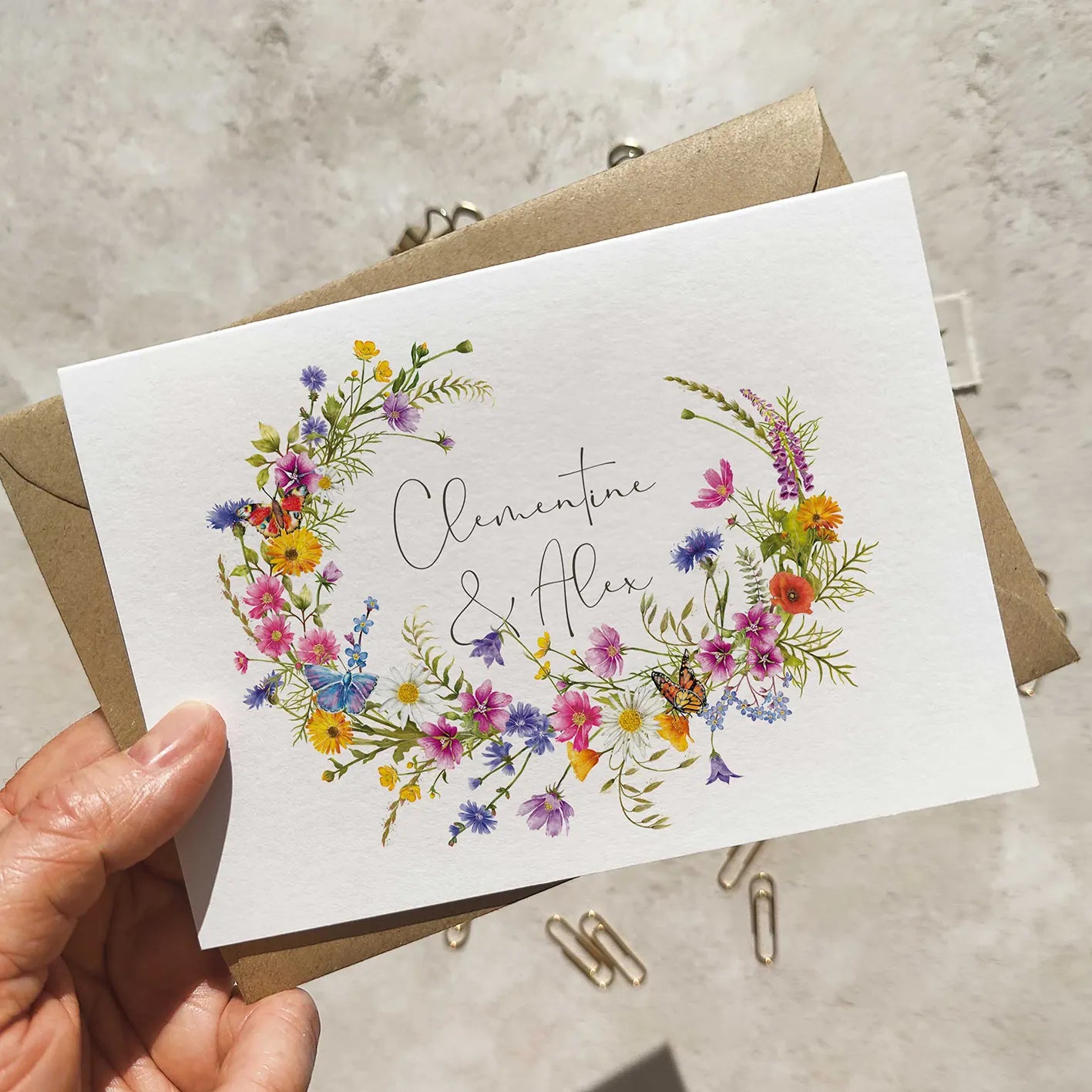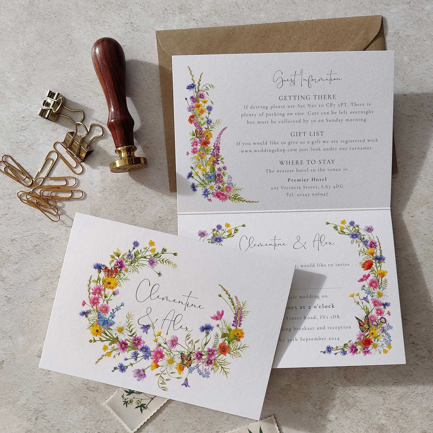 Introducing our Wildflower Folded A6 Wedding Invitation, beautifully crafted with beloved British wildflower artwork - think lovely foxgloves, bright cornflowers, and dainty buttercups. A must-have for your spring or summer wedding, bursting with lively colors and rustic charm.