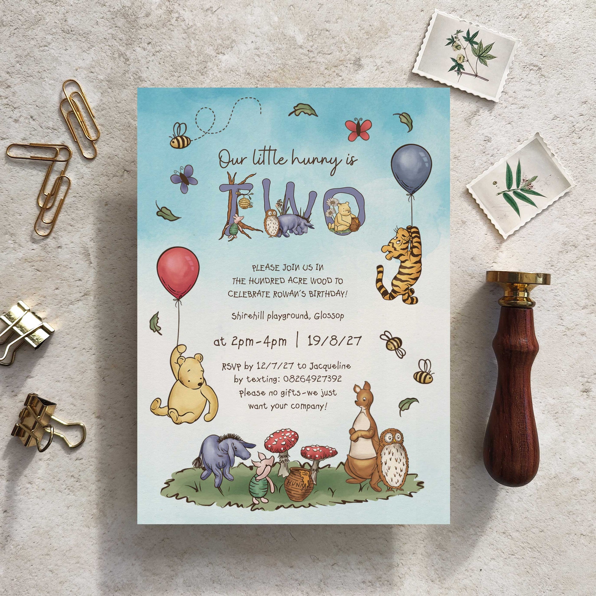 Editable child's birthday invitation using Canva online software. All of the text on this design can be edited and many of the animals. The background is not editable. There are various coloured patterned pages within the file to print on the back of your invitations. This design features our very own high quality artwork including 2 Winnie the Pooh themed fonts.