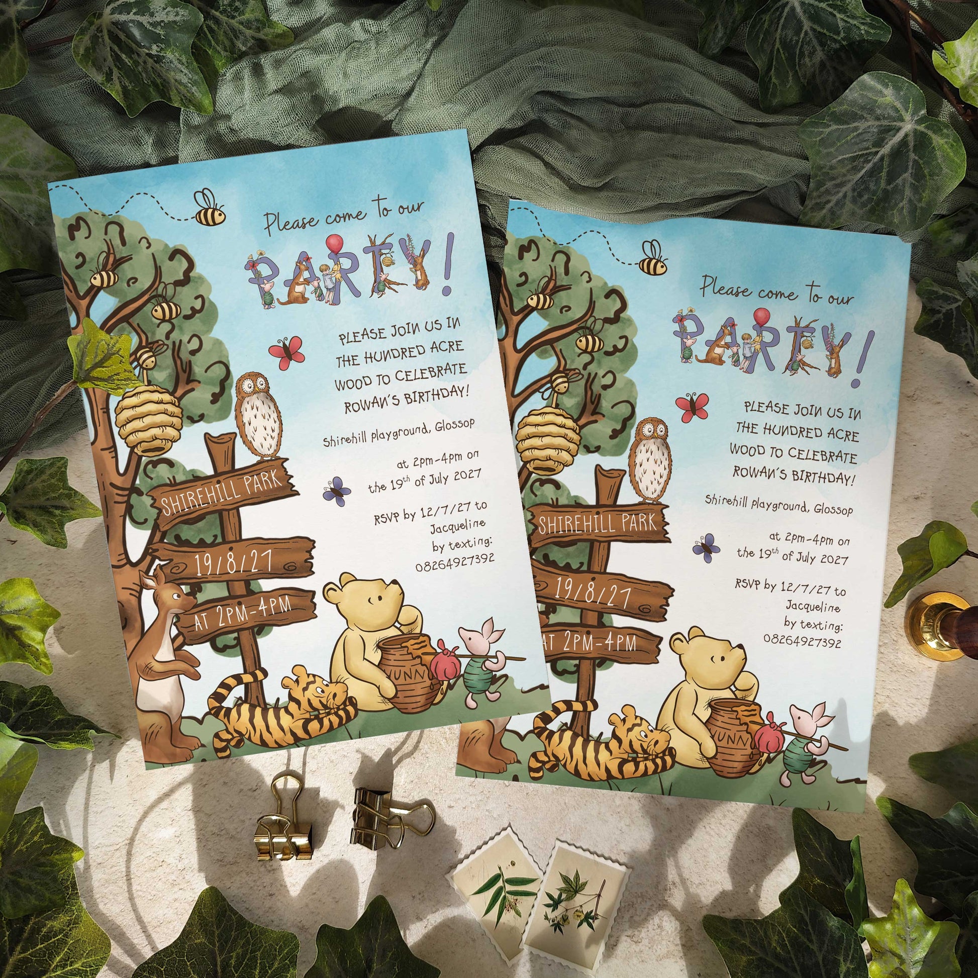 Editable child's birthday invitation using Canva online software. All of the text on this design can be edited and many of the animals. The background is not editable. There are various coloured patterned pages within the file to print on the back of your invitations. This design features our very own high quality artwork including 2 Winnie the Pooh themed fonts.